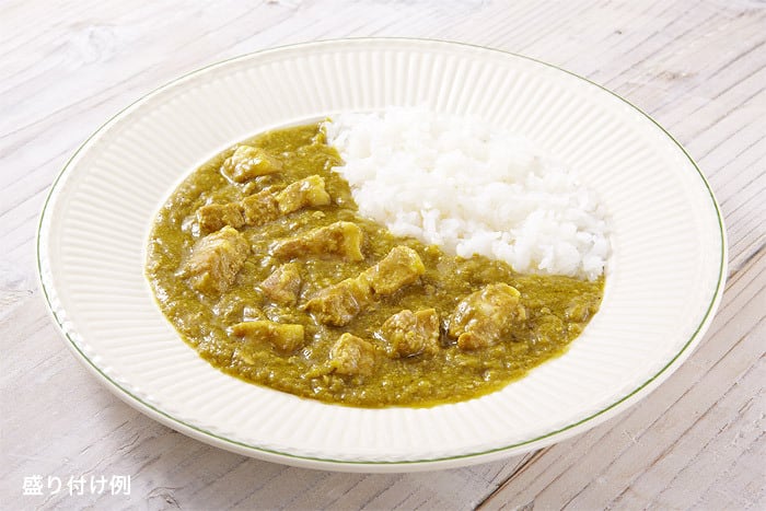 豚肉、ほうれん草、バナナ、小麦粉、綿実油、グリーンピース、りんご、玉ねぎ、人参、カレー粉、マンゴーチャツネ、鶏だし汁、塩、バター、しょうが、醤油、ごま <原材料の一部に大豆、乳、鶏肉を含む>